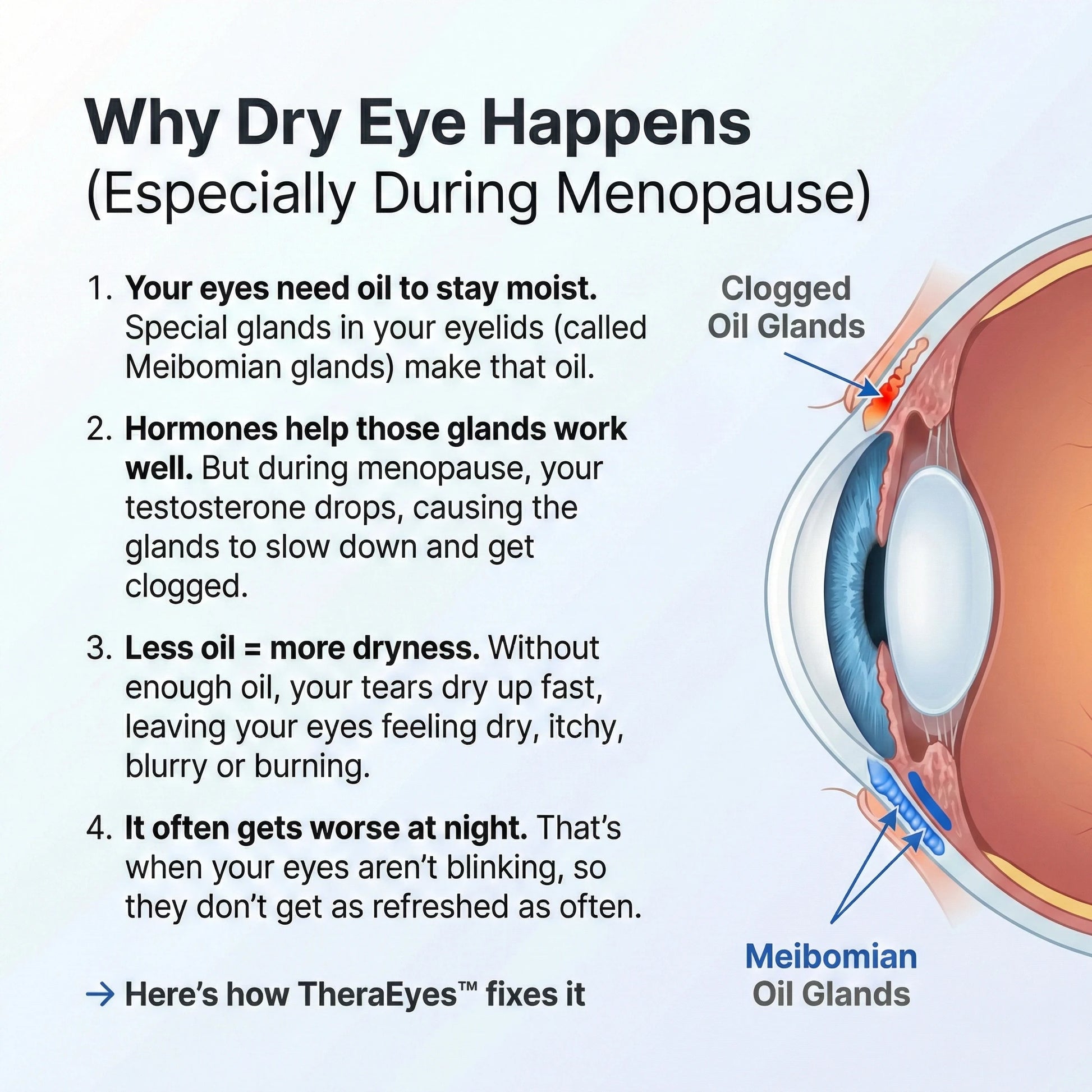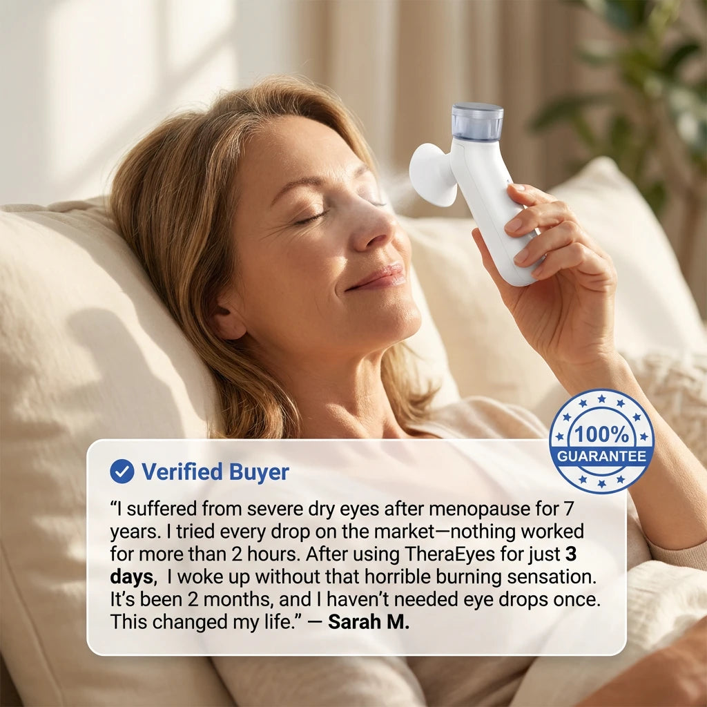 Most people don't realize chronic dry eyes come from blocked oil glands, not lack of tears. That's why drops wear off in 2 hours—they don't fix the blockage. TheraEyes uses clinical heat (38-42°C) and deep-penetrating nano-mist to unblock meibomian glands, so your eyes produce natural tears again. No more grabbing drops every hour just to see clearly.