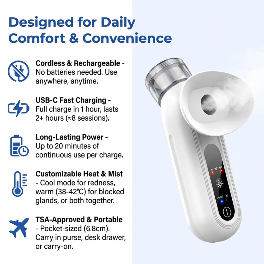 Forget wet washcloths that cool down in minutes or bulky masks that blur your vision. TheraEyes is pocket-sized, rechargeable, and works with just water. Press a button, enjoy 5 minutes of soothing warmth and moisture—at work, traveling, or at home. The gentle heat and fine mist feel therapeutic, like a mini spa session that genuinely helps.